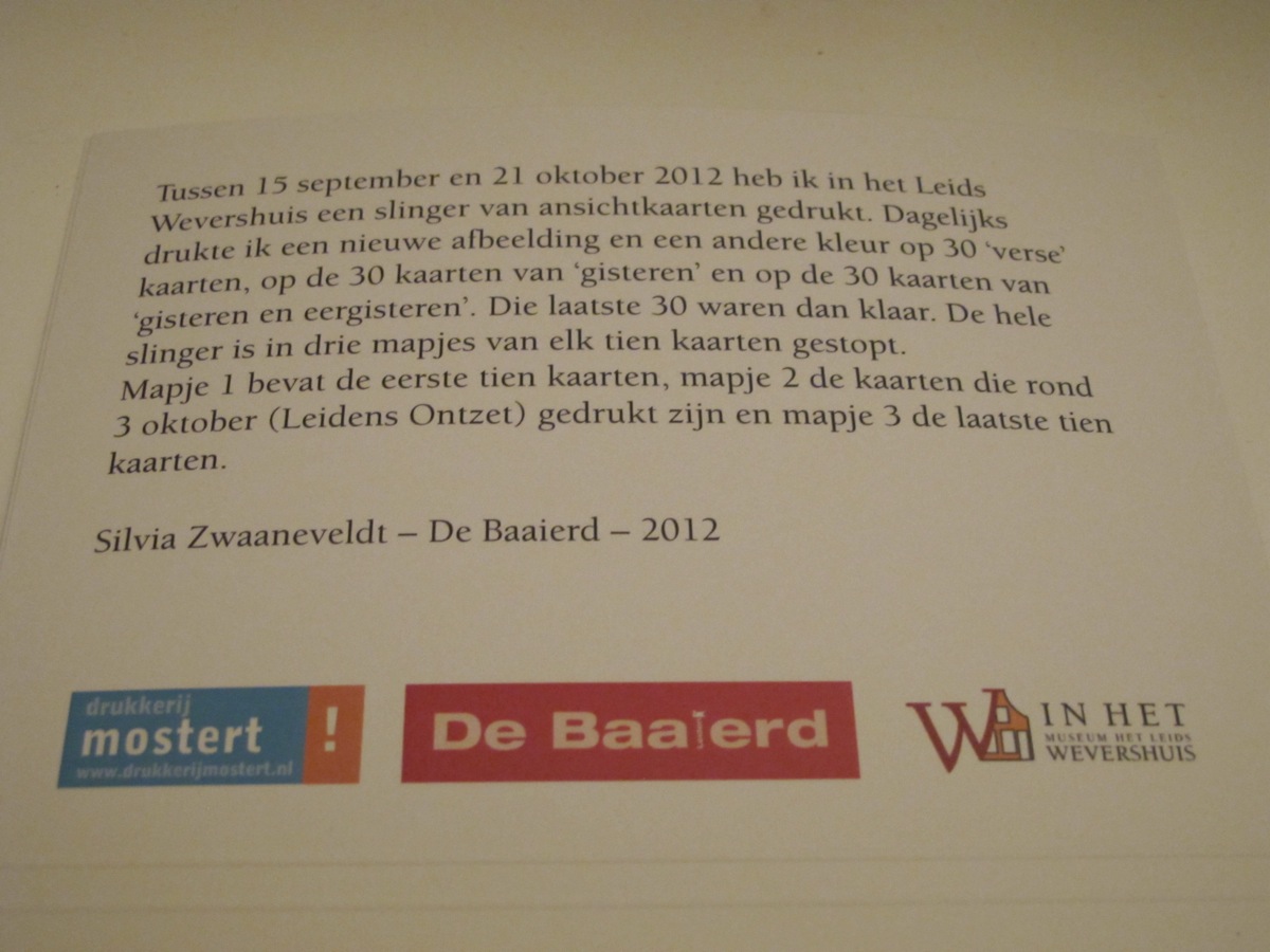 Oef, het is alweer de avond voor de BOEKKUNSTBEURS in de Pieterskerk in Leiden. Van de week werd ik geveld door de griep en dat betekent nu nog snel de laatste spullen bij elkaar zoeken voor morgen. De kaarten van de slinger heb ik in drie mapjes gestopt en zijn op de beurs te koop.