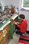 Een paar weken geleden meldden zich ’s ochtend om half tien twee jonge drukkers Okke en Rimmert in de drukkerij. Ze waren de dag begonnen met het bakken van een appeltaart voor mij en kwamen een dagje drukken. Plannen voor het drukwerk waren er ook al en zo konden ze gelijk goed van start. Okke wilde optimaal gebruik maken van het grote drukformaat van de pers en zette uit grote houten letters een poster met PECUNIA NON OLET . Rimmert had Harry Potter geraadpleegd en een toverspreukenboekje samengesteld. Dat laatste was veel meer zetwerk en leverde ook denkwerk op, want het moest immers een boekje worden. Het was een leuke dag met hard werken, goed je handen wassen voor je van de heerlijke appeltaart mocht eten, letters uitzoeken en zetten, even bijkomen met een boterhammetje met kaas, slingeren aan de pers en apetrots zijn op het resultaat en natuurlijk ook distribueren: het gebruikte zetsel weer terug in de letterkast.