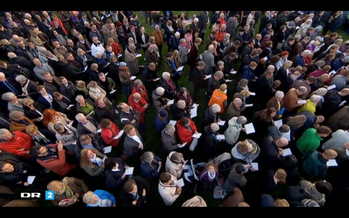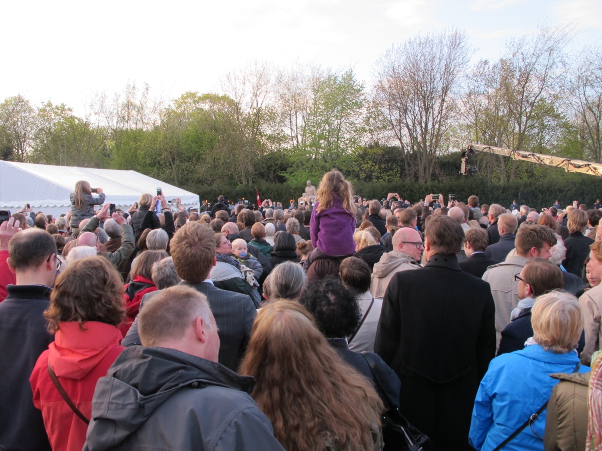 De camera zwaait over ons hoofd en dan weer terug, want Dronning Margrethe, in het blauw met blauwe hoed, legt een krans. We zingen een lied. Statsminister Helle Torning-Schmidt
