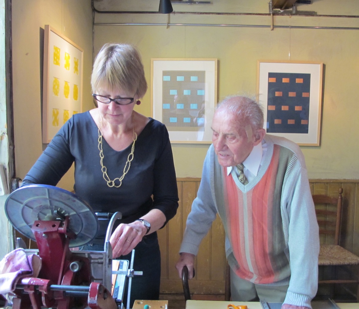 Het einde van de gang is een Miles Davis hoekje geworden om met de muziek van Miles de column BLUE van Kader Abdolah te lezen. De huiskamer, nu drukkerij hangt vol met werk van collega margedrukker Doortje de Vries van de Eikeldoorpers (www.doortjedevries.nl) uit Apeldoorn. Het is inspirerend te werken tussen haar gedrukte weefsels en werk vol met ritmes en herhalingen.