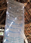 Op de zolder, die via een steile trap te bereiken is (achterwaarts de trap weer af!) hangen twee Leidse singelgedichten van Christiaan van Tol (www.christiaanvantol.nl). Ze bewegen door de wind die door de dakpannen speelt en als de zon ook nog tussen de kieren piept, geeft dit een extraatje aan de tekst.